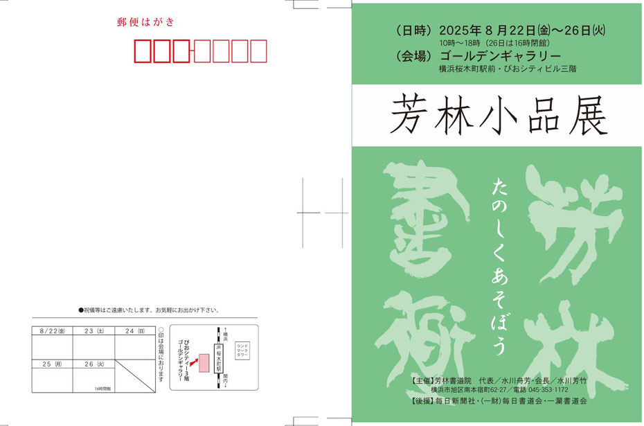 来年の芳林展が1月7日から横浜市民ギャラリーに決まり、作品〆切が11月になったので、小品展も早くなりました。部屋に飾ってたのしむ小品は人気があります。各人が心に秘めたことばを、たのしく、美しく表現してください。